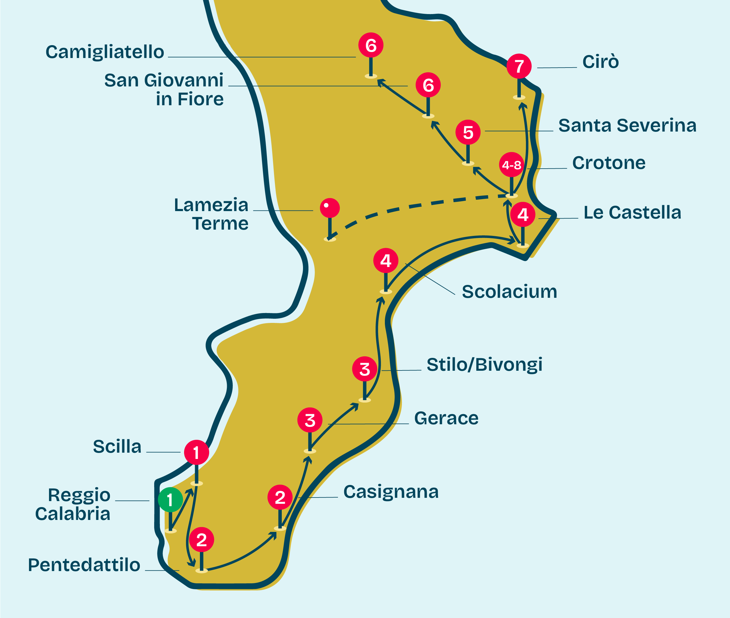 L’itinerario proposto ci fa attraversare una delle parti meno conosciute della Calabria, ma più affascinante. Un tour di otto giorni che parte da Reggio Calabria e termina a Crotone attraversando la costa orientale della Calabria e assistendo alle testimonianze gloriose della Magna Grecia, alla maestosità romana, al fascino bizantino e all’austerità normanna.